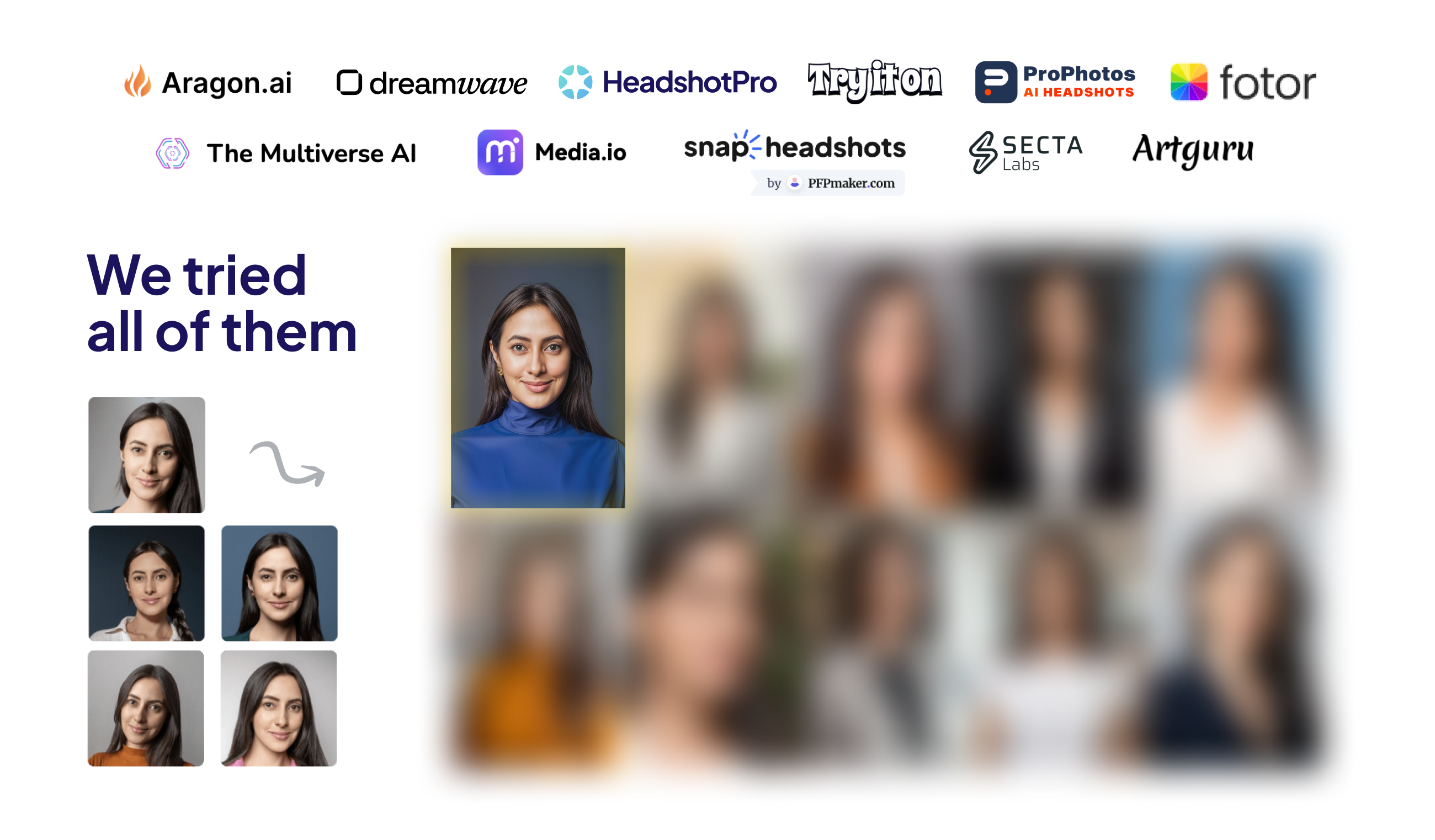 We tested a total of 11 AI headshot generators. HeadshotPro, Dreamwave, and Aragon were a clear step ahead of the remaining 8 services.