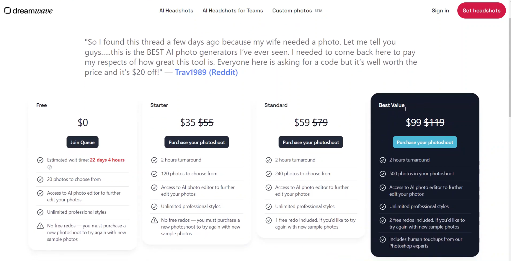 Dreamwave produced quality headshots with high resemblance in our testing. Great alternative to HeadshotPro.