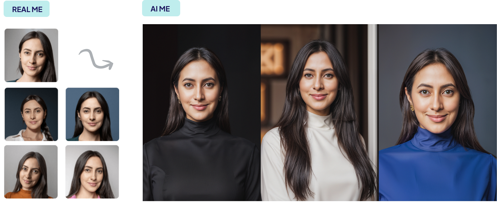 HeadshotPro's free headshot generator avoids this fate by minimizing its use of AI. Our professional headshot product creates a custom model that truly understands what you look like. Our free AI headshot product simply cleans up and enhances the photos you've supplied it with.